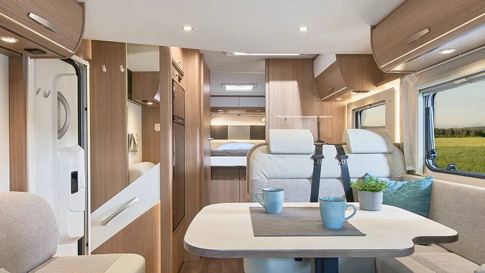 All'interno, il T449 sorprende per la sua cellula abitativa ben progettata e spaziosa, con un'altezza interna di 210 cm che offre un ambiente confortevole. La zona giorno è accogliente, con una comoda dinette perfetta per rilassarsi e socializzare. La cucina angolare è ampia e completamente attrezzata, ideale per preparare pasti deliziosi durante il viaggio.