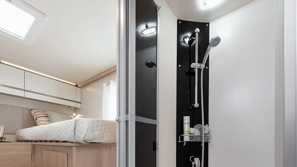 Il garage del Giottiline Siena 395 ha una portata fino a 300 kg, ideale per trasportare attrezzature e bagagli voluminosi. All'interno, la porta di separazione tra zona giorno e zona notte assicura privacy e comodità. La doccia separata, di dimensioni domestiche, garantisce un comfort simile a quello di casa. Tra gli equipaggiamenti del Pack Siena, troviamo il climatizzatore cabina, l'ESP Traction+, il Hill Holder e il Hill Descent, oltre al Cruise Control, Start & Stop, airbag passeggero, predisposizione radio e comandi al volante.