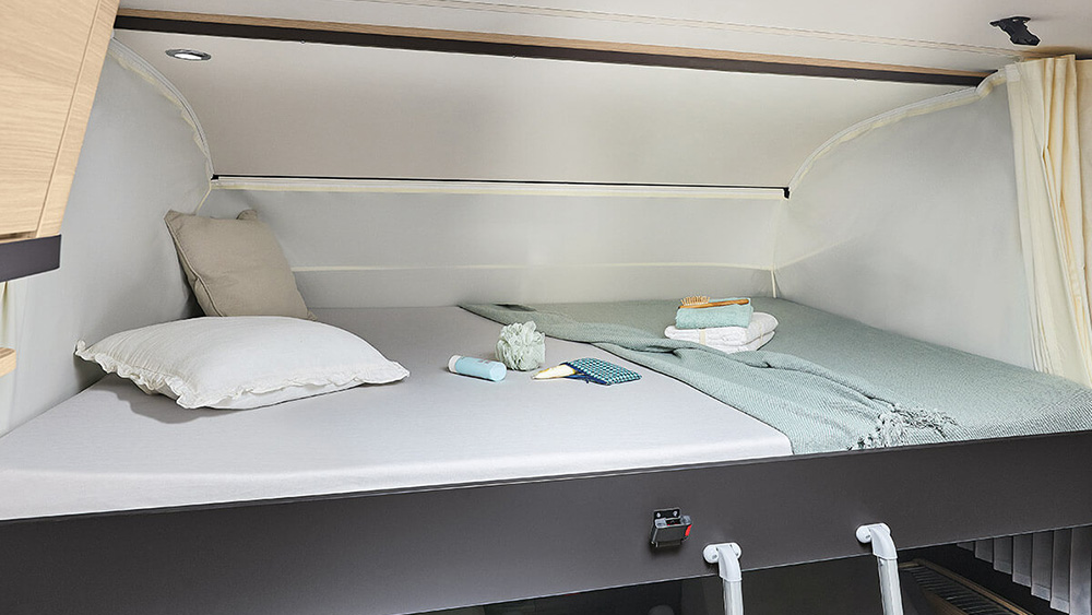 Con ben cinque posti letto di serie, questo camper accoglie comodamente la tua famiglia. Due letti a castello generosi e una cameretta bambini con possibilità di trasformazione dinette in un letto matrimoniale offrono soluzioni versatili per il sonno. Il letto cabina a scomparsa aggiunge ulteriore comfort con le sue dimensioni generose.